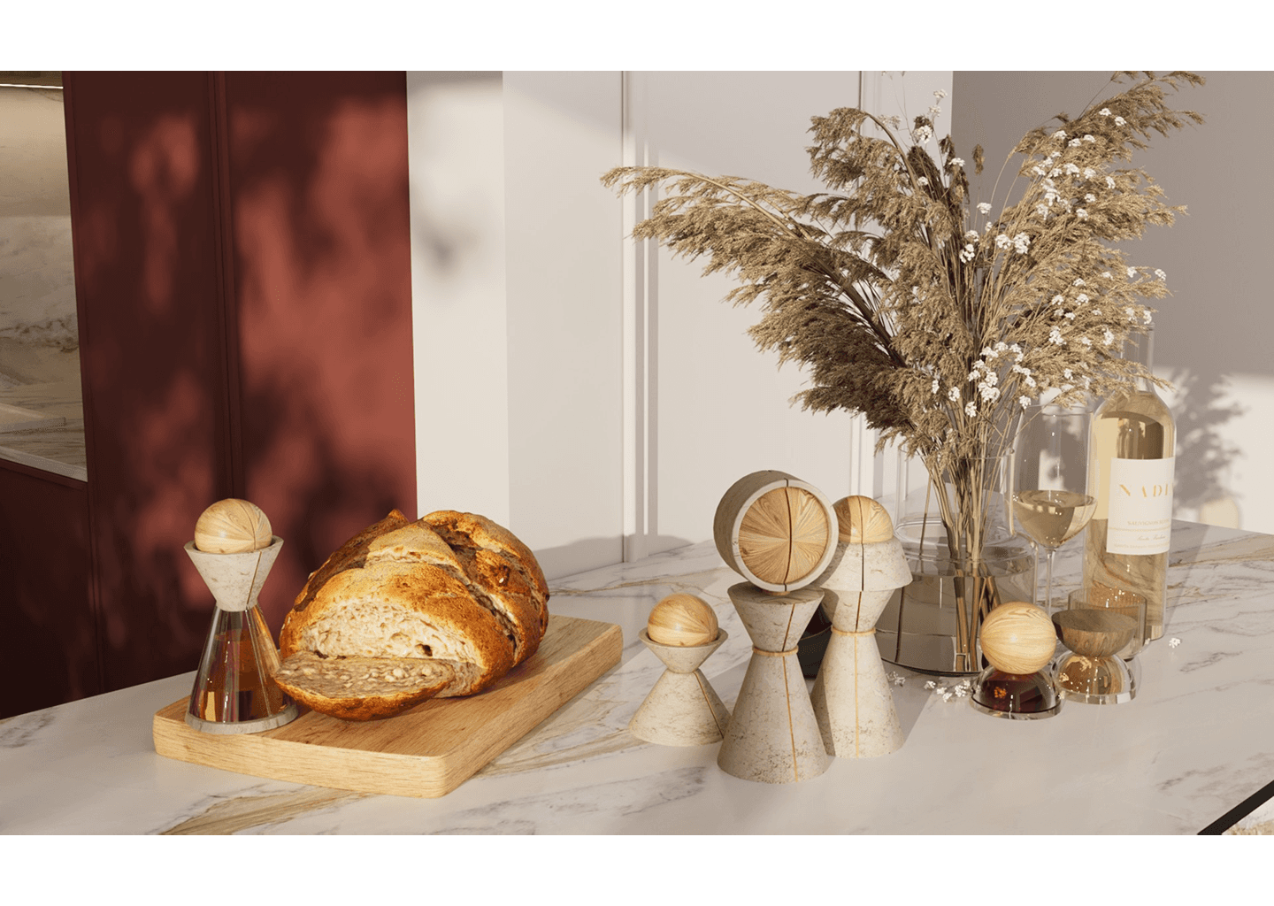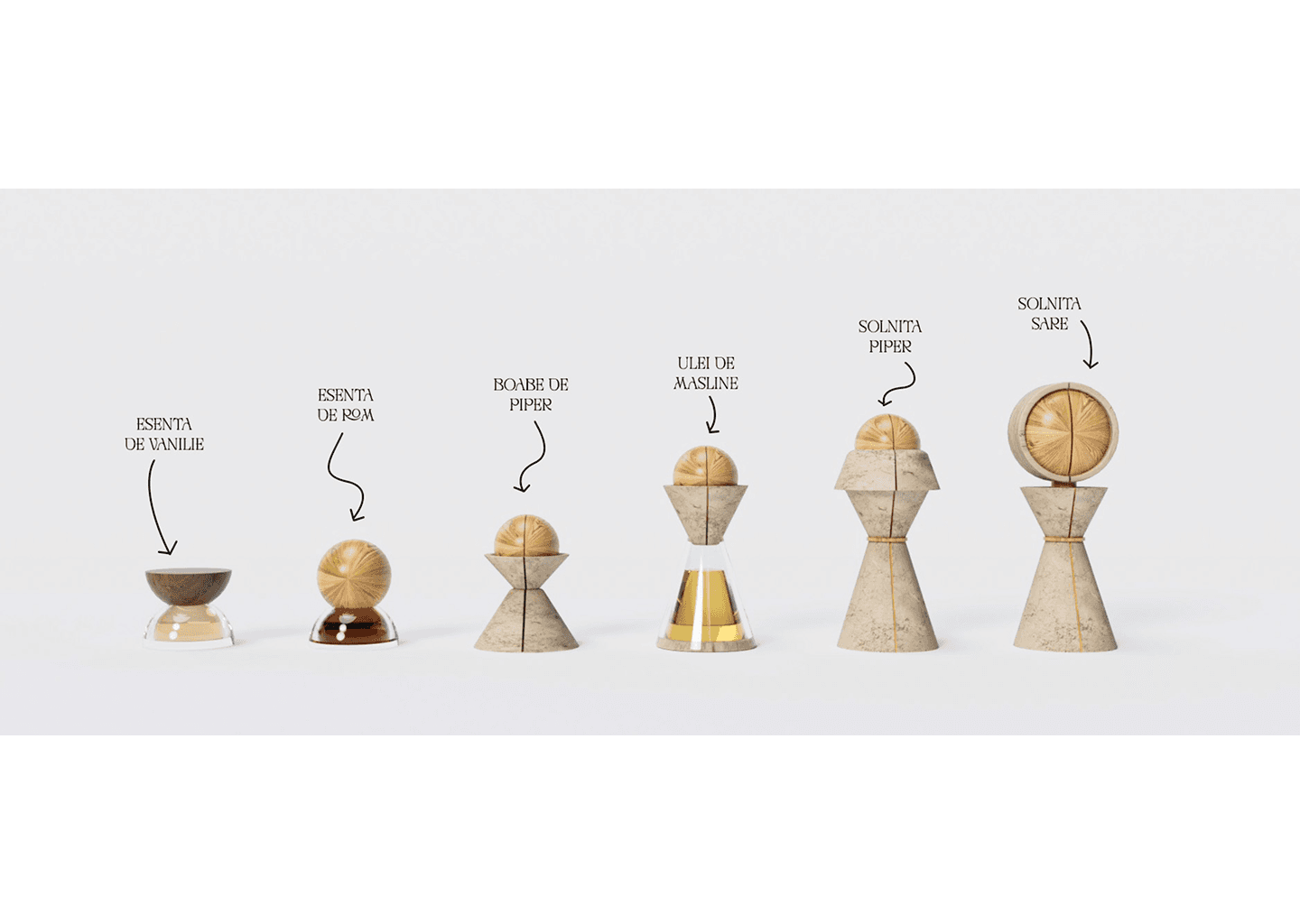 "Everyday Silhouettes" is a collection of household objects reinterpreted through a sculptural aesthetic, in which essentialized forms become carriers of meaning and refinement. Inspired by the clean lines and harmony of volumes specific to Constantin Brâncuși, the project transforms the functional into poetic, and everyday objects acquire a new visual valence. The collection brings together containers and accessories for spices, aromatic oils and culinary essences, made from natural materials. The objects are not designed only as utensils, but as small sculptures that bring a touch of subtle elegance, rhythm and presence to the kitchen space. They become catalysts of an everyday aesthetic – discreet, yet expressive – inviting us to slow down, pay attention to detail and rediscover simple everyday gestures.